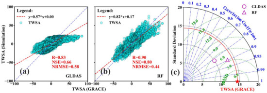 Performance comparison of the GRACE TWSA and simulated TWSA (GLDAS and RF-built TWSA) at the grid scale for 2003–2014. The 1:1 line is blue, and the fitted line is red. (a) Scatter plot of the GLDAS TWSA and GRACE TWSA time series; (b) Scatter plot of the RF-built TWSA and GRACE TWSA series; (c) Taylor diagram for comparing the GRACE TWSA data and the simulated TWSA data.