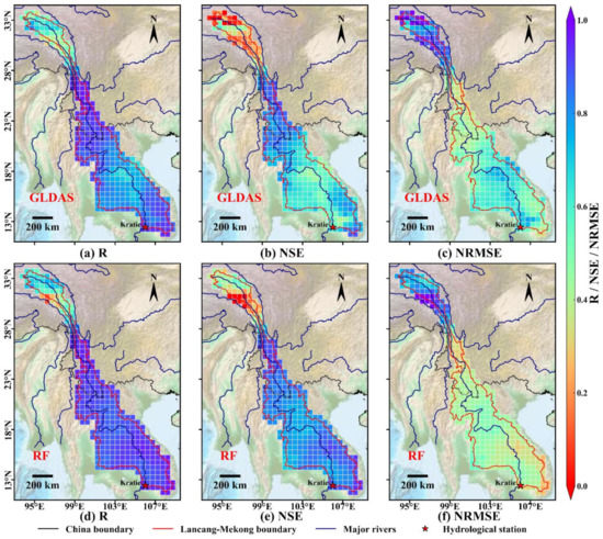 Spatial distribution of the R, NSE, and NRMSE values calculated from the GRACE TWSA and simulated TWSA (GLDAS and RF-built TWSA) for 2003–2014. (a–c) represent the analysis results of the GLDAS model, and (d–f) represent the RF model.