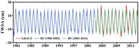 In general, the RF model can effectively construct the monthly TWSA time series and fill in missing historical data. The performance of the TWSA time series constructed by the RF model is better than that of the GLDAS TWSA at grid and basinscales. The R, NSE, and NRMSE values are 0.90, 0.80, and 0.44, respectively, for the RF model at the grid scale and 0.97, 0.93, and 0.26, respectively, at the basin scale for 2003–2014. Better performance at the basin scale is caused by wide spatial coverage. The RF-built TWSA time series achieves low performance in the northern Qinghai–Tibet Plateau region without considering the snow melting process. Moreover, the historical GRACE TWSA time series from 1980–2002 was effectively reconstructed. The GLDAS land surface model data and CRU meteorological data have greatly enriched the hydrological database, and the RF model can effectively integrate and utilize effective information to reconstruct the GRACE time series. As an ensemble learning method in machine learning, the RF model has the potential to explore the complex relationship between big data in the hydrological field.