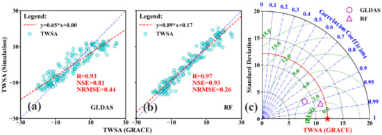 Figure 8a,b suggest the superior performance of the RF model compared to the GLDAS model for 2003–2014. Figure 8c clearly shows the advantages and disadvantages of the RF and GLDAS models. The simulated TWSA that agrees well with the GRACE TWSA lies closest to the red star and red arc. In contrast, the simulated TWSA time series from the GLDAS model shifts away from the GRACE TWSA time series. Quantitative analysis at the basin scale shows better simulation results by the RF model (R = 0.97, NSE = 0.93, NRMSE = 0.26) and less desirable results (R = 0.93, NSE = 0.81, NRMSE = 0.44) by the GLDAS model. Although the GLDAS model has good correlation, the scatter plot exhibits large deviations, while the RF-built TWSA time series is more convincing. Moreover, the performance of the TWSA time series is significantly improved at the basin scale compared to that at the grid scale.