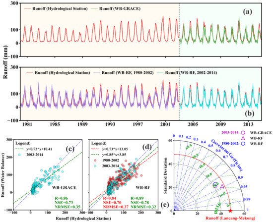 Comparison between the estimated discharge (WB-GRACE, WB-RF) and the observed discharge in the Lancang-Mekong River basin during 1980–2014. (a,b) refer to monthly estimated discharge time series using WB-GRACE and WB-RF, respectively, and the shades represent the uncertainty of discharge. (c,d) are the scatter plots of the estimated discharge and observed discharge. The 1:1 line is blue, and the fitted lines are red (1980–2002) and green (2003–2014). (e) Taylor diagram for comparing the estimated discharge and observed discharge.