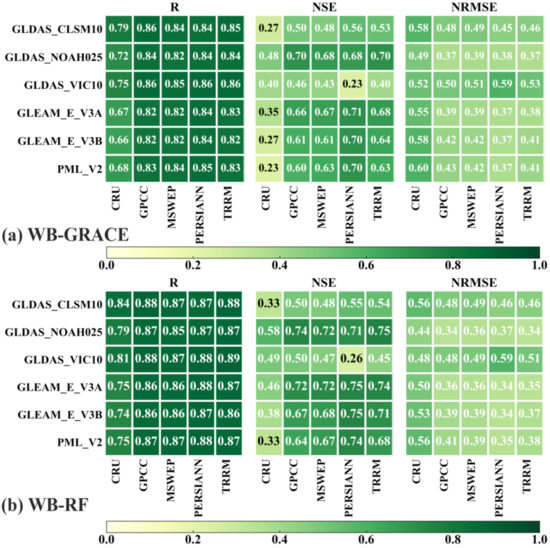 The quantitative performance of the multi-source precipitation and ET products on the estimated discharge. (a,b) refer to the estimated discharge using WB-GRACE and WB-RF, respectively.