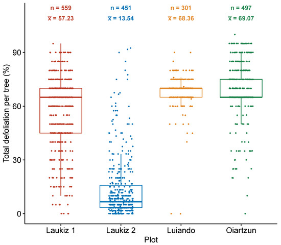 Response variable “defoliation of trees” for plots Laukiz1, Laukiz2, Luiando, and Oiartzun. n is the total number of trees in each plot, and the mean defoliation. Values for Laukiz1, Luiando, and Oiartzun were observed in 5% intervals; for Laukiz2, defoliation was observed at multiple heights and then averaged, leading to smaller defoliation differences than 5%.