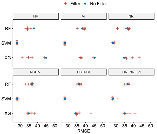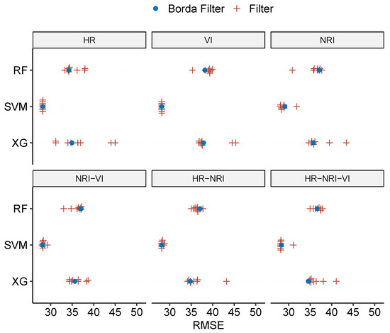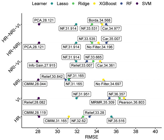 The combination of feature sets showed small increases in performance for some learners. XGBoost scored slightly better on the combined datasets HR-NRI, NRI-VI, and HR-NRI-VI compared to their standalone variants (NRI and VI) (Figure 3). However, the best performances for RF and XGBoost were scored on NRI and HR, respectively. RF showed a substantial performance increase when using only NRI compared to all other feature sets, whereas for XGBoost, the worst performances were associated with the VI- and NRI-only feature sets (Figure 3).