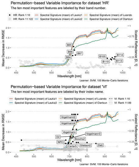In this work, permutation-based feature importance was calculated to estimate feature importance or effects [61]. With the limitations in mind when applied to correlated features, the aim was to get a general overview of the feature importance of the hyperspectral bands while trying to avoid an over-interpretation of results. The best-performing algorithm on the HR task (i.e., SVM) was used for the feature importance calculation.