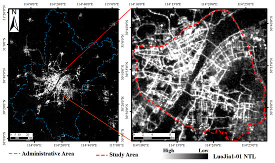 Nighttime light (NTL) remote sensing can effectively reveal the human activities in urban development. NTL remote sensing data can record the light from buildings, roads and vehicles, etc., at night by satellite sensors [4]. It has a statistically significant correlation with human activities such as population distribution, economic growth and infrastructure [5]. Therefore, it is widely used in urbanization monitoring to estimate GDP, population, electrical consumption, the extraction of built-up areas and the estimation of housing vacancy rate [6,7,8]. However, due to the coarse spatial resolution and blooming effect of NTL data, current studies are more often applied to the outside of the city. In order to provide a reference for the NTL application in the urban interior, it is crucial to comprehensively understand the composition of NTL and the factors influencing NTL variations [9]. Currently, commonly used NTL data are observed by various sensors and platforms, such as the Defense Meteorological Satellite Program-Operational Linescan System (DMSP-OLS) [10] and Suomi National Polar-Orbiting Partnership Satellite’s Visible Infrared Imaging Radiometer Suite (NPP-VIIRS) [11]. As a new generation of NTL satellite, Luojia 1-01 was launched by Wuhan University of China on 2 June 2018 [12]. Compared with DMSP-OLS and NPP-VIIRS, Luojia 1-01 NTL data provide more abundant details [13]. It provides a solution for the application of NTL data in the urban interior.