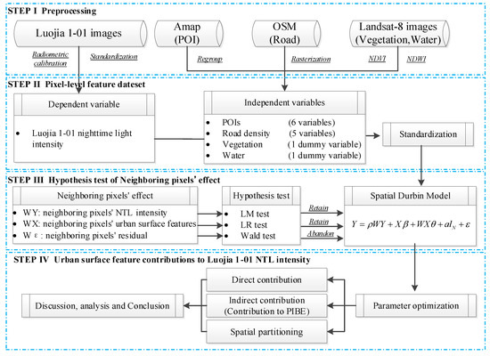 This study used Luojia 1-01 NTL and urban surface features (13 variables from water body, vegetation, POIs and Roads) to build a spatial autoregressive model at pixel level. Figure 3 illustrates the processes of this article. Based on the research basis of previous studies on the NTL interaction between different areas, hypothesis testing was used to determine which neighboring effects should be put into the model. Finally, according to the direct and indirect effects, we explored the contributions of different urban surface features to NTL intensity and PIBE.