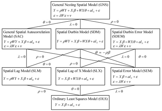 Relationship between different spatial autoregressive models. Due to over parameterization, the GNS model and the SAC model are very difficult to explain. Thus, they are rarely applied in empirical research [40]. Therefore, we do not discuss them in this article.