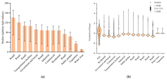 Without considering neighboring pixels, common statistics can display an intuitive comparison of the NTL radiance of different urban surfaces. Figure 5a compares the NTL radiance of different urban surfaces. According to Figure 5a, the pixels where roads and transportation facilities are located produce significantly more light than other pixels (the median is greater than 100). Considerable natural surfaces (such as water and vegetation) are usually illuminated at night, with the median NTL radiance clearly greater than 0. This phenomenon is usually due to the PIBE of NTL.