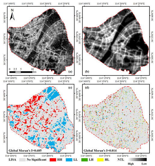 (a) NTL intensity observed by Luojia 1-01 image; (b) NTL intensity simulated by SDM model; (c) local Moran’s I of OLS model regression residual; (d) local Moran’s I of SDM model regression residual. HH represents the aggregation of high values and high values. LL represents the aggregation of low values and low values. LH represents low values surrounded by high values. HL represents high values surrounded by low values. No Significant represents the residuals’ approximately random distribution.