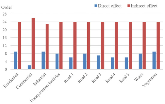 The estimation results of the SDM model are shown in Table S2, but the total/direct/indirect effect (Table 5) were generally used instead of the regression coefficient (Table S2) to measure the contributions. Table 5 displays the total effect, direct effect and indirect effect of different independent variables in the SDM model. The total effect of road1 was 0.508: for any center pixel, 1 standard deviation (SD) increase in the road1 contributed a 0.508 SD increase to the NTL intensity. A total of 12% of this contribution derived from the direct effect and contributed a 0.061 SD increase to the center pixel’s NTL intensity. A total of 88% of this contribution derived from the indirect effect and contributed a 0.447 SD increase to the PIBE (including low-order neighbor and high-order neighbor). The total effect of vegetation was −0.958: when any center pixel changed from non-vegetation to vegetation, the NTL intensity would decrease 0.958 SD. A total of 8% of this contribution derived from the direct effect and contributed a 0.077 SD decrease to the center pixel’s NTL. 92% of this contribution comes from the indirect effect and contributes 0.881 SD decrease to the PIBE. The contributions of different urban surface features can be compared, because the model is set in standardized mode. This comparison does not include vegetation and water because they were used as dummy variables. According to Table 5, the contribution of roads decreased with the reduction in the road grade (road5 was the lowest). The total, direct and indirect contributions of vegetation and water were significantly negative, but the inhibitory effect of water on PIBE was weaker than that of vegetation (absolute value of indirect effect: 0.800 < 0.881).