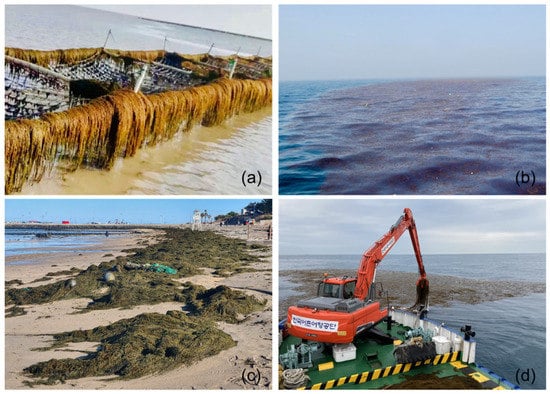 (a) Sargassum biomass affecting Pyropia yezoensis aquaculture area in the Yellow Sea (YS) []; (b) Sargassum patches in the East China Sea (ECS); (c) Sargassum biomass comes into Samyang Beach in Jeju Island []; (d) pre-collection of Sargassum biomass around the Korean Peninsula [].