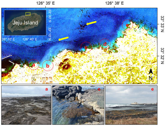 Rayleigh-corrected reflectance (RhoC) Sentinel-2 MSI true-color composite image (R: 665 nm, G: 560 nm, B: 490 nm) acquired near the northern coast of Jeju Island on 27 January 2021. Sargassum is observed as black slicks in the water (yellow arrows). Locations of field surveys measuring Sargassum ((a). Samyang-dong Beach; (b). Samyang Beach; (c). Shinchon Beach; (d). Jukdo Beach; (e) Shinheung-lee Beach). Spectral measurements were performed on the Sargassum Sinchon Beach. These photos were obtained during field survey from 17 to 19 February 2021.