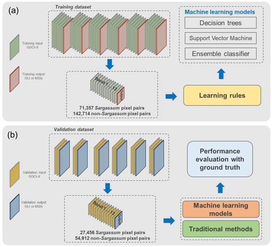 Schematic diagram of the procedure used for detecting Sargassum. (a) Training step for machine learning models; (b) validation step for the evaluation of machine learning models and traditional methods. Training and validation dataset were composed of GOCI-II RhoC images with 12 wavelength spectral bands as input and ground truth data from OLI or MSIs as output (refer to Table 2).