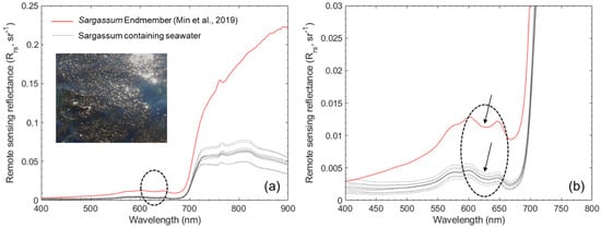 (a) Remote sensing reflectance spectra of pure Sargassum Endmember (Min et al., 2019) and Sargassum containing seawater measured on the coast of Jeju Island in Korea; (b) enlarged view of dotted oval in Figure 4a. Note the local reflectance minimum at around 632 nm (black arrow) that results from chlorophyll c pigment absorption, and the difference between the enhanced reflectance between 580 and 650 nm (dotted oval) and the reflectance below 550 nm.