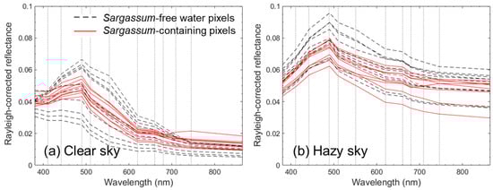 GOCI-II Rayleigh-corrected spectral reflectance (RhoC (λ)) of Sargassum-free water and Sargassum-containing pixels 2 UTC on 3rd ((a): clear sky) and 10th ((b): hazy sky) February 2021 at the locations shown in Figure 3.