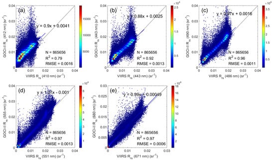 Comparison between VIIRS Rrs and GOCI-II Rrs. The (a) 410; (b) 443; (c) 486; (d) 551, and (e) 671 nm of VIIRS wavelength bands matched with 412; 443; 490; 555, and 680 nm of GOCI-II wavelength bands, respectively.