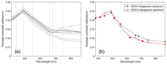 (a) The average spectrum of Sargassum at 2 UTC on 3 February 2021 from GOCI-I RhoC; (b) Sargassum spectra obtained using GOCI-I (black star) and GOCI-II (red square). The additional GOCI-II bands include the wavelengths 380 (band 1); 510 (band 5); 620 (band 7), and 709 nm (band 10). These bands are represented by the filled red squares.