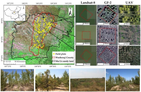 Spatial distribution of the observations from the field survey and the Landsat-8, GaoFen-2, and UAV images of the Mu Us Sandy Land.