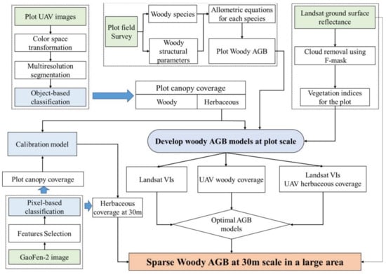 The overall flow scheme of the woody AGB estimation of the sparse mixed forest is shown in Figure 2. It includes the following major steps: (1) calculating the plot-level AGB based on the field measurements and allometric equations for each plot; (2) surveying the woody and herbaceous vegetation coverage based on the classification of the UAV image; (3) developing different plot-level AGB models using the Landsat, UAV, and GaoFen-2 images; (4) calibrating the woody and herbaceous coverage derived from the GaoFen-2 image based on the UAV measurements; (5) validating the accuracies of the AGB estimates derived from the different plot-level AGB models and calibrating the vegetation coverage derived from the GaoFen-2 image. In addition, the sparse woody AGB in a large area was estimated using the optimal AGB model based on the Landsat and GaoFen-2 images.