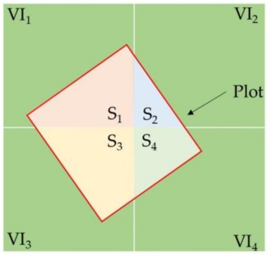 where VIplot is the VI corresponding to the field plot, VIi is the VI of the ith pixel covered by the plot range, Splot is the total area of the plot, and Si is the area of the ith pixel within the plot range. The scope of Si was delineated through manual interpretation using Arcmap 10.5.