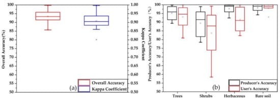 UAV images corresponding to 102 plots were classified in this study (e.g., Figure 4). The classification accuracy of all the UAV images was assessed using the error matrix method [], and the accuracy metrics of the classification are illustrated in Figure 5. As can be seen, the average overall accuracy and the Kappa coefficient are 93.44% and 0.91, respectively, and the average producer’s accuracy and user’s accuracy are 94.11 and 93.90% for all plots, respectively. It can also be seen that the classification accuracy of the bare soil is the highest, and the classification accuracy of the shrub is the lowest. This classification was then used for calculating the canopy coverage of woody and herbaceous vegetation.