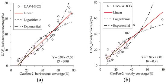 Calibration models for woody and herbaceous coverage derived from GaoFen-2 imagery: (a) herbaceous coverage calibration model, and (b) woody coverage calibration model.