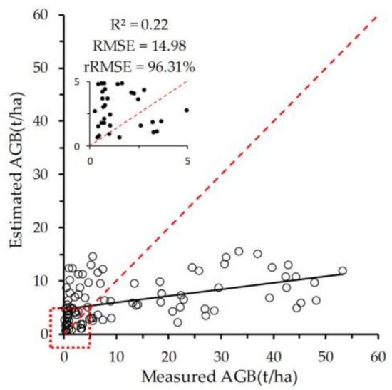 Accuracy assessment of the estimated woody AGB obtained using the woody coverage-AGB model in the scheme 1. The black line represents the regression line, the red line represents the 1:1 line.