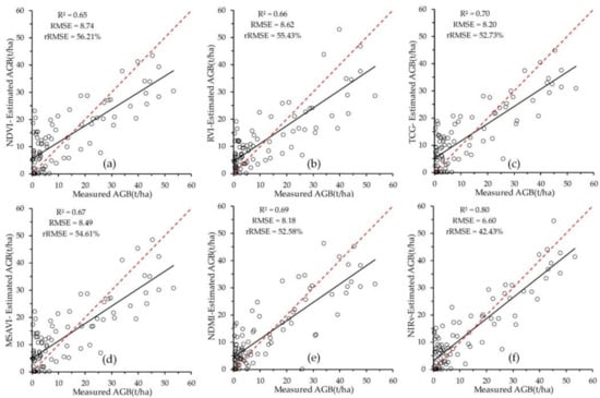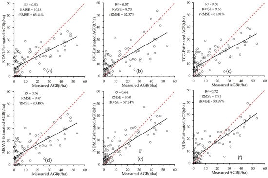 Accuracy assessment of the woody AGB estimated using the VI-AGB models for the (a) NDVI; (b) RVI; (c) TCG; (d) MSAVI; (e) NDMI, and (f) NIRv in scheme 2. The black line represents the regression line, the red line represents the 1:1 line.
