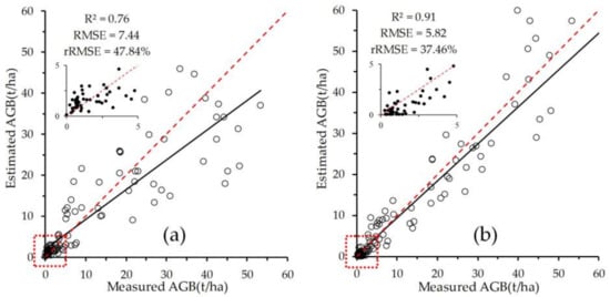 Accuracy assessment of the woody AGBs estimated using (a) the stratified models based on two woody vegetation types and (b) stratified models based on five woody species. The black line represents the regression line, the red line represents the 1:1 line.