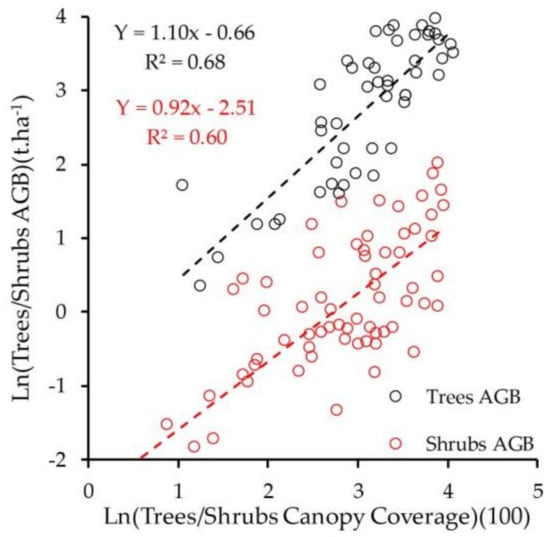 To explain the impact of woody vegetation types on the accuracy of woody coverage-AGB model, we compared the relationship between canopy coverage and woody AGB of the trees and shrubs, as illustrated in the Figure 13, and it was found that the woody coverage-AGB regression models for trees and shrubs are significantly different, which could be explained by the divergent ratios of the crown area to the canopy height of trees and shrubs []. For example, although the canopy coverages derived from crown area of trees and shrubs are same, the AGB of them could be significantly different as a result from difference in height of trees and shrubs.