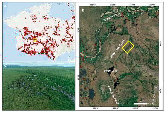 The Seward Peninsula in northwestern Alaska showing (a) the location of tundra beaver ponds (red dots) that have been mapped in the region since 2010, (b) Worldview-2 satellite image (Image copyright DigitalGlobe, Inc., Longmont, CO, USA) of Swan Lake and Swan Lake Creek from 8 June 2020, showing the stream study site (yellow box) with beaver ponds (red dots), and (c) an oblique aerial photograph from an unmanned aircraft system (UAS) acquired on 6 August 2021 showing beaver-induced permafrost degradation and the focus of this study.