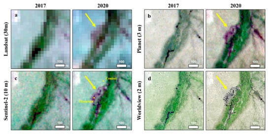 Multi-scale remote sensing image pairs bracketing the development of the beaver-induced permafrost degradation feature in the Swan Lake Creek drainage between 2017 and 2020. (a) Landsat-8, (b) Sentinel-2, (c) PlanetLabs, Inc. CubeSat Imagery, and (d) Worldview-2 imagery (Images copyright DigitalGlobe, Inc., Oakland, CA, USA). The feature is visible in all 2020 images, but it is best resolved at spatial resolutions of 10 m and finer. The yellow pixels highlighted in the 2020 Sentinel-2 image represent the locations of the disturbed and control sites for the multi-spectral indices time series analysis.