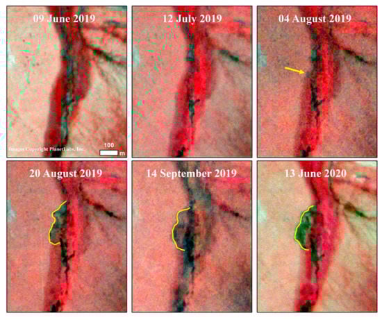 PlanetLabs, Inc. CubeSat false-color infrared image time series of the beaver-induced permafrost degradation feature at the Swan Lake Creek study site. The high temporal resolution offered by the PlanetLabs, Inc. constellation of CubeSats provides critical information on the timing of events associated with the beaver-induced permafrost degradation feature. An initial disturbance to the near-surface permafrost terrain is evident in the image from 4 August 2019 (yellow arrow). The image from 20 August 2019 shows that the majority of the disturbance occurred between 4 August and 20 August 2019. Images acquired later in 2019 and in early 2020 indicate that thermokarst processes are likely increasing the area of the permafrost degradation feature at a slower rate since its rapid development.