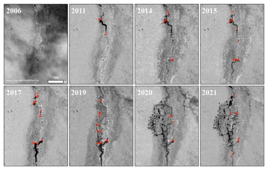 VHRS time series of imagery from the DigitalGlobe, Inc./MAXAR constellation of satellites showing the establishment of beavers in the Swan Lake Creek drainage after 2006. Dam building activity increased through 2017 when the main stream channel was routed to the northwest towards an ice-rich permafrost hillslope. The dam system ultimately failed between 2019 and 2020 and the catastrophic flood led to the development of a permafrost degradation feature formed by processes of fluvio-thermal erosion, thermal erosion, and subsequent thermokarst. Images are from 27 August 2006 (Quickbird-2), 27 July 2011 (Worldview-1), 5 August 2014 (GeoEye-1), 23 June 2015 (Worldview-1), 14 July 2017 (Worldview-2), 8 July 2019 (Worldview-1), 8 June 2020 (Worldview-2), and 5 August 2021 (Worldview-3). The red lines indicate the location of beaver dams in each image frame. All images are copyright DigitalGlobe, Inc.