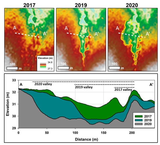We used a time series of digital surface model (DSM) data derived from the ArcticDEM project to assess the impact of beaver engineering on land surface elevation changes. ArcticDEM is a National Geospatial-Intelligence Agency (NGA)–National Science Foundation (NSF) public–private initiative to automatically produce a high-resolution, high quality, digital surface model (DSM) of the Arctic using optical stereo imagery, high-performance computing, and open-source photogrammetry software []. Suitable images were available for the Swan Lake Creek study site from 14 July 2017, 11 July 2019, and 8 June 2020. The data were provided with a vertical and horizontal accuracy of 6 and 4 m, respectively. To account for the vertical and horizontal differences in the datasets, identifiable landscape features were used to align the 2017 and 2019 images to the 2020 data with a horizontal accuracy of ~1.0 m and a vertical accuracy of ~0.5 m. The spatial resolution of the DSM products are 2 m and they allowed for the quantification of land surface elevation changes and the lateral expansion of the creek valley as a result of beaver engineering and permafrost degradation.