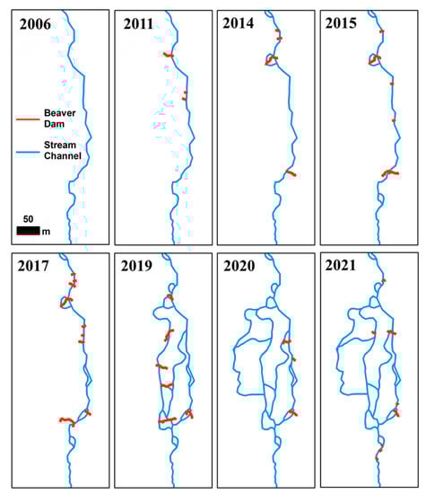 Beaver dams and the evolution of the stream channel network were mapped in the time series of commercial VHRS images from 2006 to 2021. Panchromatic imagery ranging from 0.5 to 1.0 m spatial resolution were acquired from the years 2006, 2011, 2014, 2015, 2017, 2019, 2020, and 2021. The imagery was orthorectified using the 2 arc-second resolution U.S. Geologic Survey National Elevation Dataset for Alaska and independent checks on the horizontal alignment of the image time series showed that the data were within +/− 4 m horizontally. This bias was removed by further rectifying each image to the 2021 image and then beaver dams and stream channels were manually mapped at a scale of 1:500 as vector line features in a GIS framework for each image in the time series [].