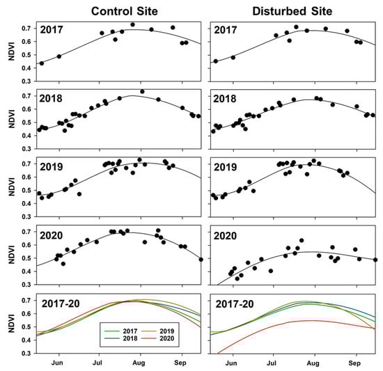NDVI data derived from a time series of Sentinel-2 satellite imagery acquired between 2017 and 2020 for a control site and a site within the beaver-induced permafrost degradation feature area. The black dots indicate single-pixel, individual NDVI values from a particular Sentinel-2 image, while the black curves represent the time integrated NDVI value for each site for each year based on LOESS smoothing using a 3rd order polynomial. The beaver induced permafrost degradation feature is evident in the rapid decline in NDVI that started in August 2019 and also reflected in the reduction in NDVI values during the entire 2020 growing season.