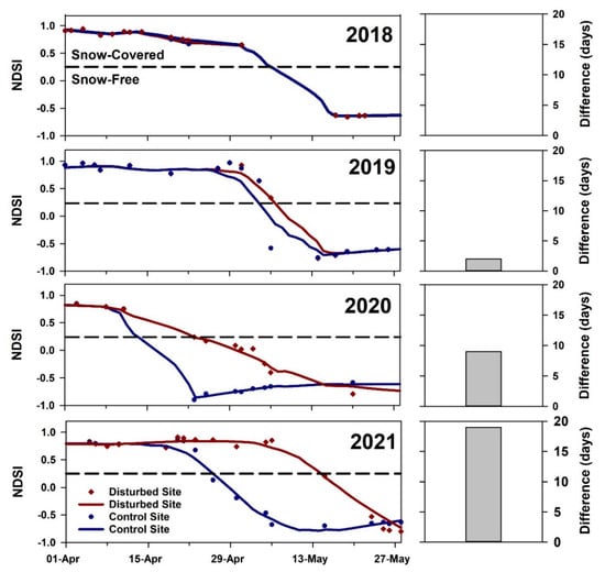 The beaver-induced permafrost degradation feature also resulted in a difference in the timing of snowmelt relative to an adjacent unaffected control site (Figure 9). Pixel-based NDSI data were extracted from the same locations used for the NDVI analysis. The snow melted at both sites on the same day in 2018 (5 May) and within two days of one another in 2019 (4 May and 6 May), the spring before the disturbance. The abrupt increase in the time that snow lingers as a result of the beaver-induced permafrost degradation feature becomes evident in 2020 and 2021. The spring following permafrost degradation, the snow lasted eight days longer at the disturbed site (22 April 2020) relative to the control site (13 April 2020). Two years after the initial disturbance the snow at the disturbed site (14 May 2021) lingered 19 days longer than at the control site (25 April 2021).