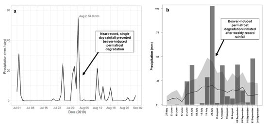 Precipitation data plots based on the US National Weather Service station located in Nome, Alaska. (a) Plot of daily rainfall (mm/day) from July and August 2019 showing the extreme precipitation event on 2 August 2019, two days before initial failure of the beaver dam complex was noticed in the PlantLabs, Inc. (Pleasant Grove, CA, USA) satellite imagery (Figure 4). (b) Daily precipitation data aggregated into weekly bins showing the weekly summer rainfall during 2019 (dark grey bars), the mean weekly rainfall (black line) and the standard deviation (light grey shaded area) in weekly rainfall for the 15-year period from 2006 to 2020. The nine days prior to the failure of the beaver dam complex and initiation of the permafrost degradation feature were the highest on record during the period of beaver occurrence in the Swan Lake Creek study area.