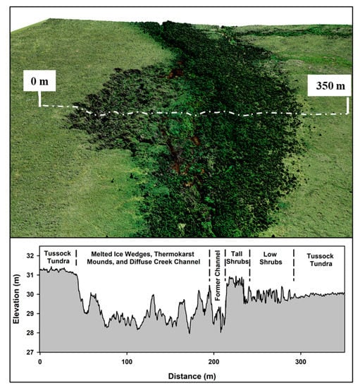 A 15 cm resolution, colorized digital surface model derived from the UAS survey data (top) and extracted elevation profile (bottom) for the portion of Swan Lake Creek most heavily disturbed by the beaver-induced permafrost degradation. Numerous features are evident in the elevation profile data, from left to right—gently sloping tussock tundra that is underlain by ice rich permafrost; the area of beaver-induced permafrost degradation showing melted ice wedges, intervening thermokarst mounds, and the now diffuse creek channel; tall shrubs; low shrubs; and gently sloping tussock tundra.