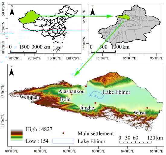 The Ebinur Lake Watershed (43°38′~45°52′N and 79°53′~85°02′E) is located in the arid area of Northwest China (Figure 1). The study area has a typical continental arid climate, characterized by dramatic annual temperature change, scarce precipitation, and strong potential evaporation [32,33], and the lake basin is surrounded by mountains on the south, west, and north sides, which block outside airflow [34]. Climate change easily affects the basin’s water resources and ecosystems. The Ebinur Lake watershed is an important ecological barrier for environmental changes in the Junggar Basin in Xinjiang Uygur Autonomous Region (XUAR), which is a typical inland lake basin in an arid region [35]. Some studies found that the LUCC of the watershed has changed greatly [36]. However, the influence of LUCC on LST in the Ebinur Lake Watershed is not yet clear and needs to be further investigated.