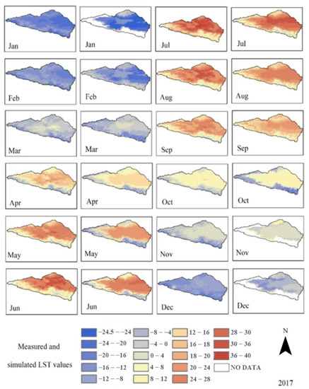 In addition to verifying the LST over time, its spatial accuracy should be verified as well. Therefore, according to the remote sensing LST inversion dataset in China, the simulated LST based on the VIC model and its spatial distribution were compared and studied. However, through verification, it was found that the accuracy of the LST simulated by the VIC model for cold months is inaccurate, especially in January and December, where the LST is even greater than 0 in high-altitude mountainous areas in winter. According to Koch’s research [30], who found that the warmth of the VIC model in cold months is obvious, VIC has a distinct seasonality in its bias with a warm bias in winter (~3 °C) as opposed to a slight cool bias in summer (~−1 °C), which is related to an underestimation of the actual evapotranspiration and altitude. Our study area is located in an arid area, and the actual evapotranspiration in winter is small, which does not affect the accuracy of the LST simulated by the VIC model for areas other than high-altitude mountainous areas. To ensure the reasonableness of the data, the simulated LST values of the high-altitude mountainous area in November, January and December were deleted and converted to a no-data area. Taking 2017 as an example, the spatial resolutions were 0.05° and 1/12° respectively, as shown in Figure 4. It can be seen that the LST simulated by the VIC model has a high spatial consistency with the measured LST. The LST in the higher altitude area is significantly lower than that in other areas. As the time changes, the LST inside and outside the basin both “increase first and then decrease”, and the simulated LST is slightly lower than the measured data.