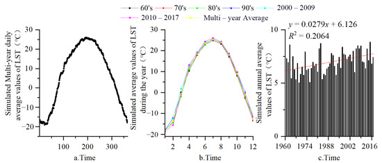 Under the global warming background, experts and scholars in different fields are paying more and more attention to changes in LST. The evolution of the global LST trend in the past century is diagnosed using the spatial–temporally multidimensional ensemble empirical mode decomposition method, the fastest warming in recent decades (>0.4 K per decade) occurred in northern mid-latitudes [19]. It also showed a particularly enhanced trend of LST in semi-arid regions [20]. However, the existing studies on LST dynamics mainly focused on the depiction and quantitative temporal comparison of LST spatial distribution or LST time series analysis over time [21]. The relationship between LST and other climate elements is less involved. Moreover, there are still some difficulties in the long-term large-scale continuous simulation of LST in data-scarce areas.