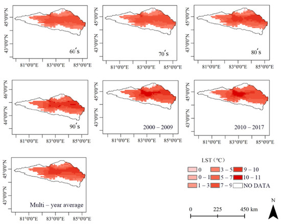 The LST changes within the basin are not obvious, and the degree of change is different (Figure 6). The main manifestation is the gradual decrease of the high LST areas in the east and the gradual increase of the central LST. The LST range changed from −11.48–9.04 °C in the 1960s to −11.14–9.56 °C in the 1980s, and then to −3.5–10.51 °C in 2010–2017, with the average values being 3.28 °C, 5.24 °C, and 6.79 °C, respectively. These results show that the LST in this area has an increasing trend. Although the range of high-value areas in the east has decreased, gradually shrinking to the low vegetation coverage area near Lake Ebinur, the LST value has increased, and the multi-year average LST in other regions has increased compared with the values in the 1960s. Therefore, the LST of the basin is increasing.