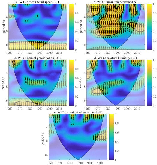 WTC analysis of mean wind speed and LST (a), WTC analysis of mean temperature and LST (b), WTC analysis of annual precipitation and LST (c), WTC analysis of relative humidity and LST (d), WTC analysis of duration of sunshine and LST (e). (Note: The right axis generally reflects the consistency of periodic "change trends" between sequences, similar to the correlation coefficient. The larger the coefficient, the higher the correlation and the more consistent the change.).