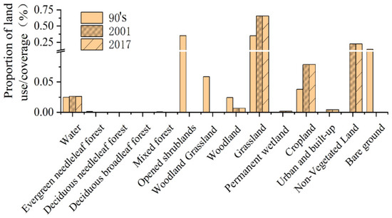 The order of land cover types in the Ebinur Lake Watershed in 2017 (Figure 9c) was grassland > non-vegetation land > cropland > water > woodland > urban and built-up > permanent wetland > evergreen needleleaf forest > deciduous broadleaf forest > mixed forest > woodland grassland > open shrubland > deciduous needleleaf forest. This is consistent with the ranking in 2001, and the area has not changed much. Grassland and non-vegetation land are also the main land cover types in the study area (Figure 10).