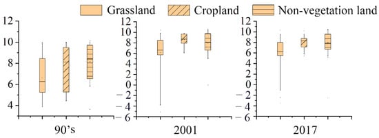 In the 90s, the LST of grassland ranged from 5.2 to 8.4 °C, with a median of 6.3 °C; the LST of cropland ranged from 5.3 to 9.5 °C, with a median of 8.1 °C; the LST of non-vegetation land was in the range of 6.5–9.7 °C, with a median of 8.4 °C.