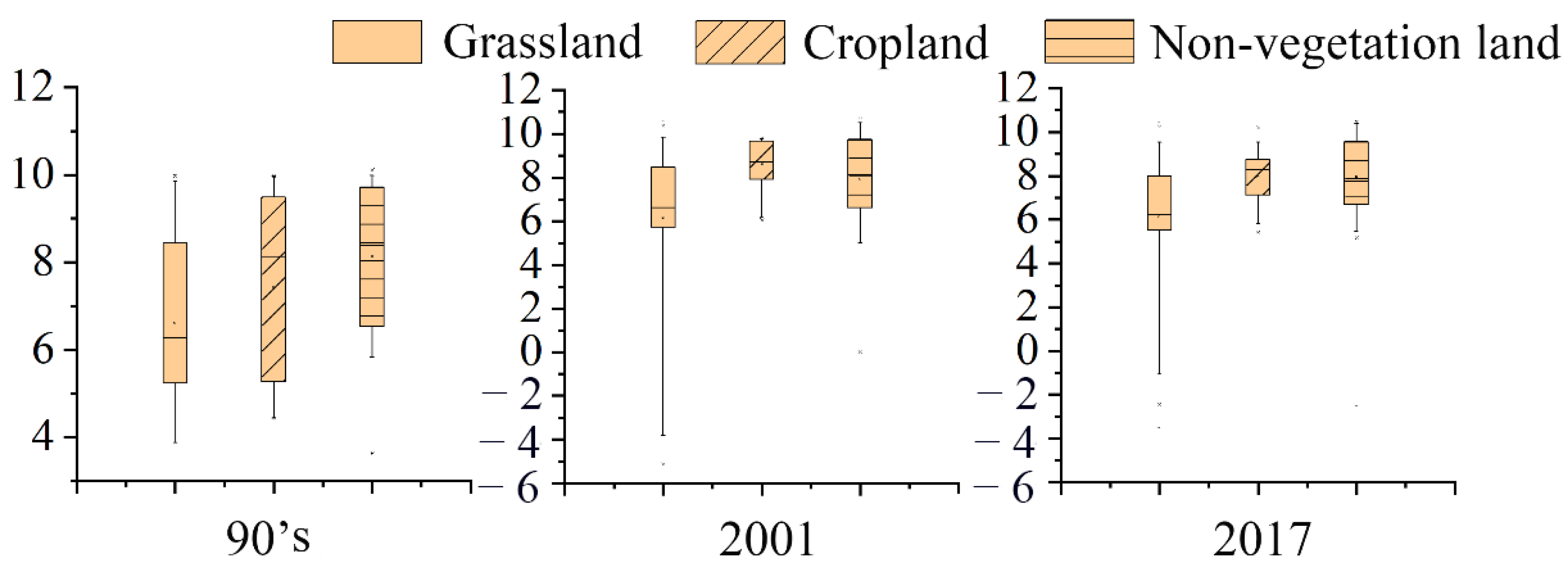 - From 1960 to 2017, the LUCC of the Ebinur Lake Watershed underwent major changes, and the reduction of open shrubs may have caused the LST increase in this area.