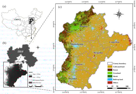 Location of the study area in (a) China and (b) Hebei Province. (c) The land-use types obtained from the annual China Land Cover Dataset (CLCD) in 2017.